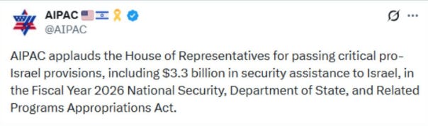The bill guarantees at least $3.3 billion in Foreign Military Financing grants for Israel, and it fast-tracks disbursement by requiring that the assistance be distributed within 30 days of enactment. This, even as Israel continues to commit genocide in Gaza, has killed more than 400 Palestinians since the alleged “ceasefire” took hold, continues to block vital aid from entering into Gaza, and according to reports, has broken the ceasefire nearly 1000 times.