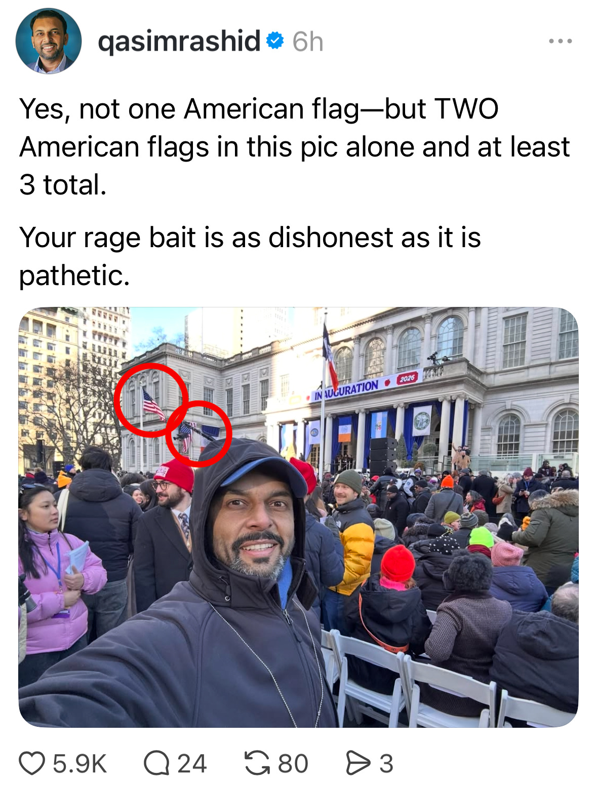 But the fact remains that this petty and arbitrary talking point of “no American flags” is going viral throughout right wing media, leading only to more hate, disinformation, and fear. They will paint Mayor Mamdani as anti-American, try to foster fear against him, and try to derail his affordability agenda. Do not let them use such petty culture wars to divide working people. Billionaires are waging an all out class war against us to maintain the status quo—a status quo that works only for them. We must resist.