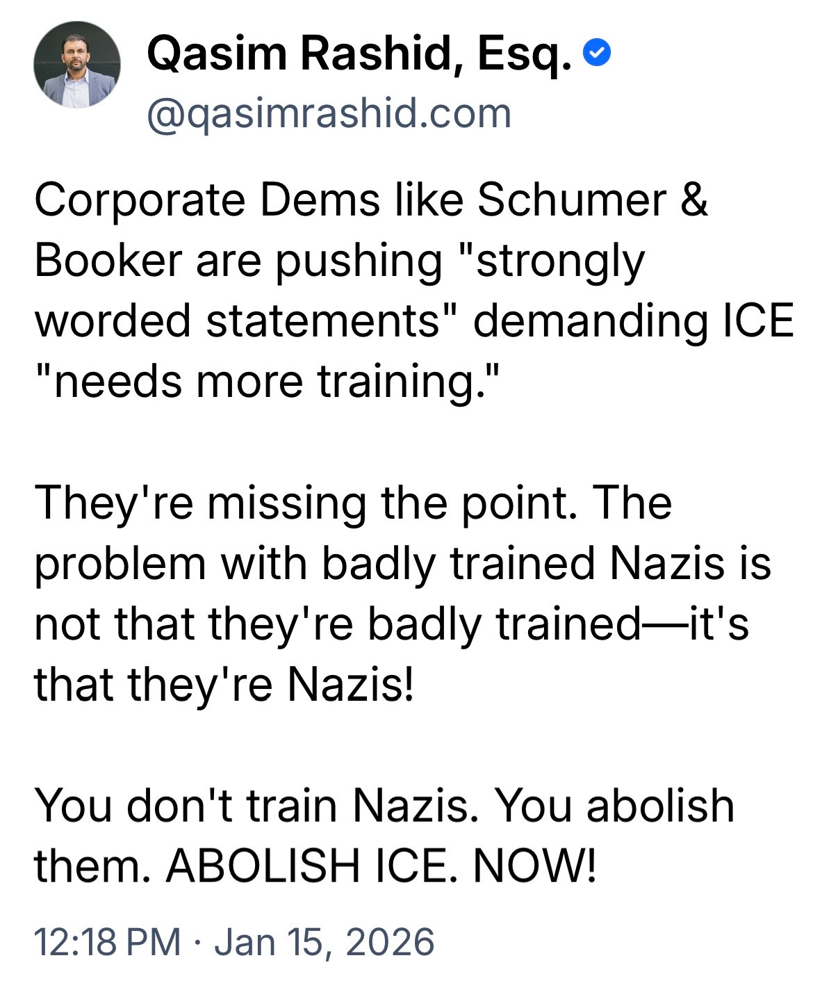 Rep Jayapal calls on the immediate urgency that Congress not provide another dime of funding for ICE and CBP without serious accountability. Not the type of accountability that Schumer and Booker are talking about. We’re talking about the real prosecution of officers who murder people. The basic due process of law.