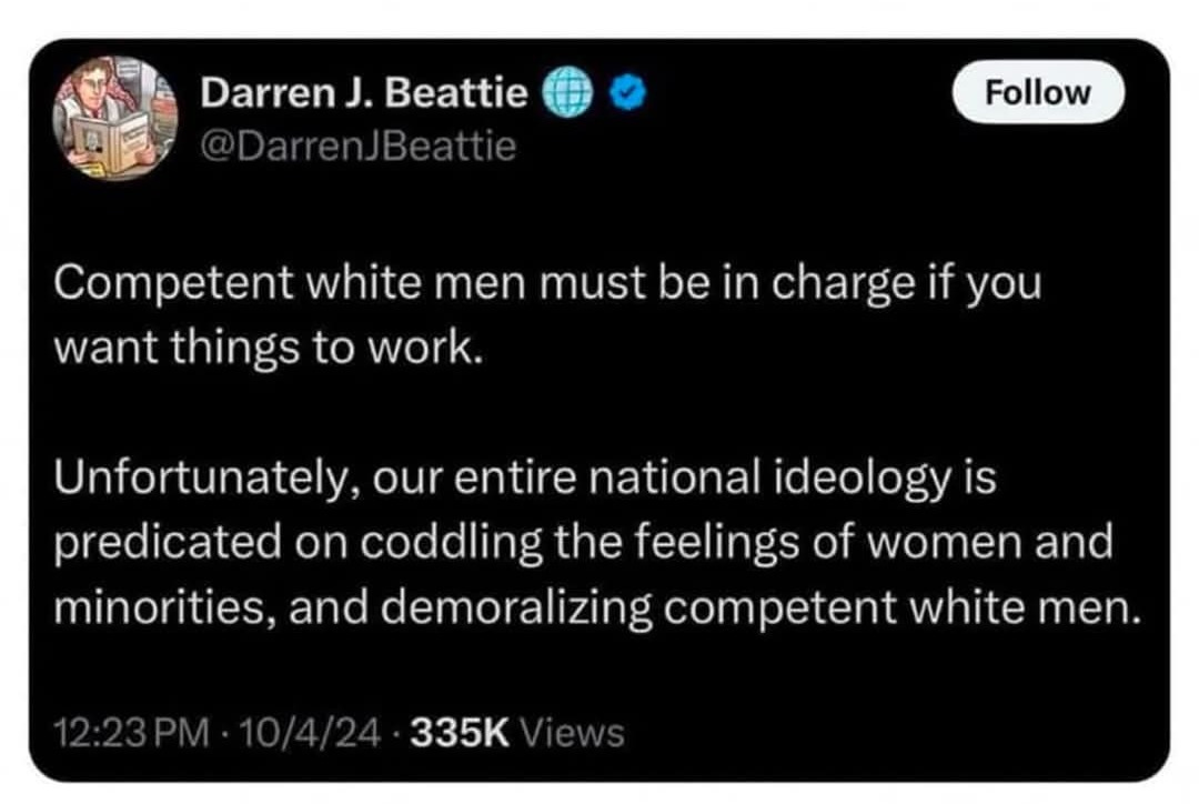 Competent white men must be in charge if you want things to work. Unfortunately, our entire national ideology is predicated on coddling the feelings of women and minorities, and demoralizing competent white men.