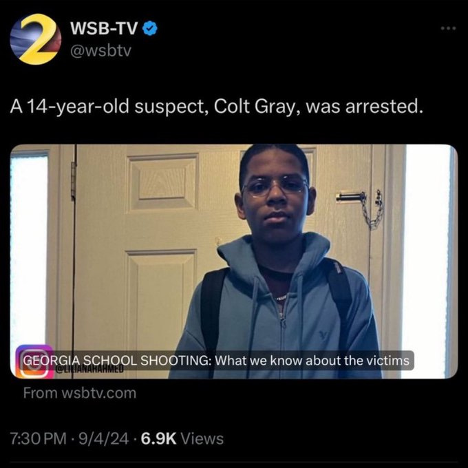 And even when Black people are victims of mass shootings or police violence, media often demonizes them as villains. Consider this most recent case of the Apalachee high school shooting. Colt Gray, who is white, was the shooter. Yet @wsbtv tweeted to their 1.2 million followers a photo of Mason Schermerhorn—the Black child who was murdered—with the caption, "A 14-year-old suspect, Colt Gray, was arrested."