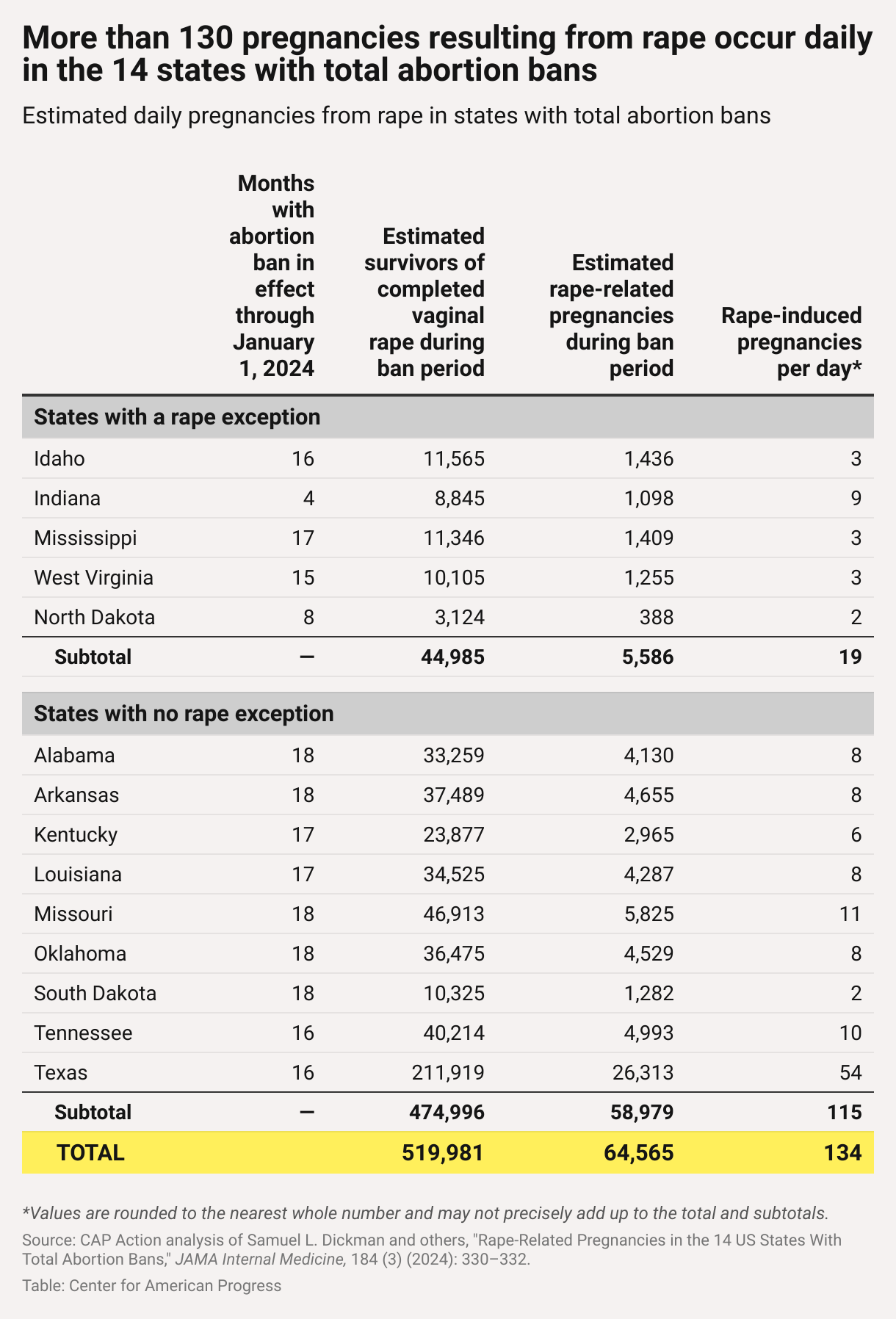 Estimated 519,981 survivors of completed rape experienced 64,565 rape-related pregnancies during the 4 to 18 months that bans were in effect.