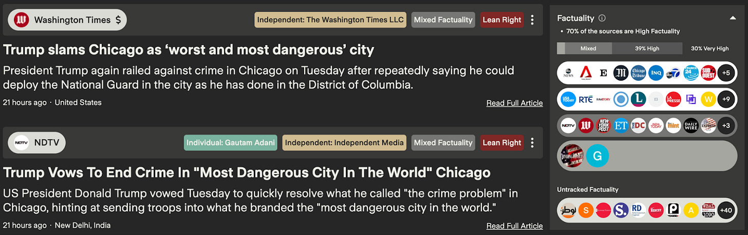 Never mind all the above data I cited to demonstrate that Chicago is not even in the top 25 most violent cities, and that the majority of illegal guns here are due to weak gun laws in Red states, not due to Chicago’s gun laws. Instead, ABC News — which has already capitulated to Trump with a $15 million settlement to appease him after criticizing his policies — decides to continue to appease an aspiring autocrat. This is incredibly dangerous, destructive, and warrants tools to ensure we are staying informed on the facts.