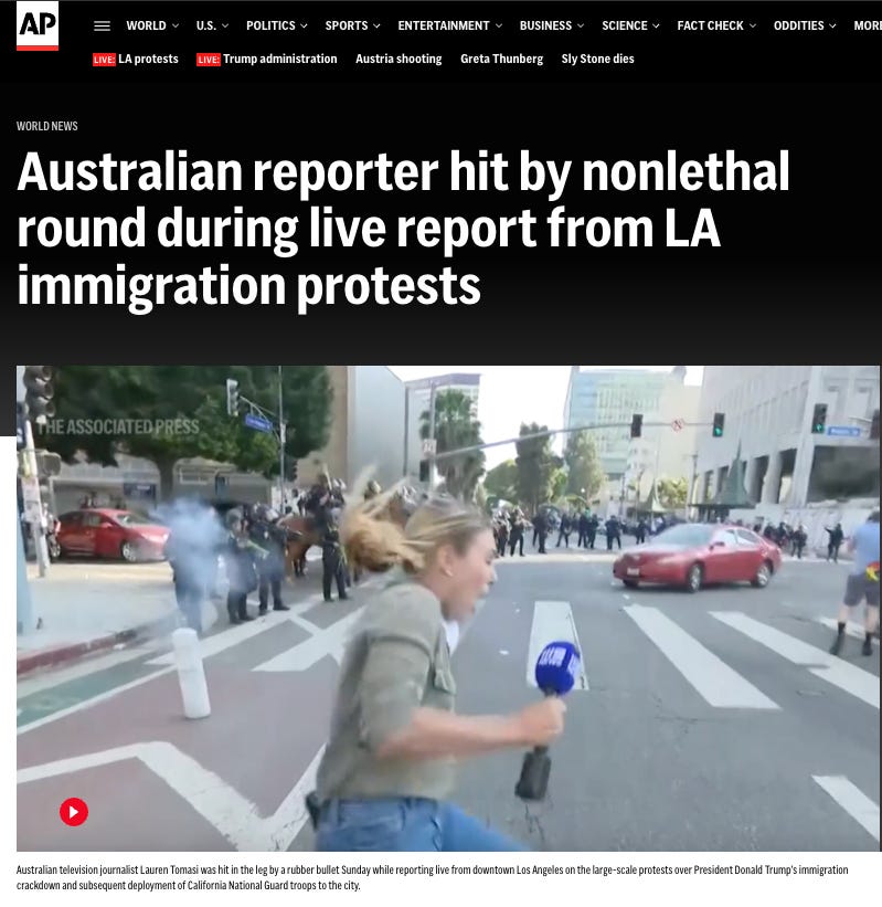 The Associated Press, that old bastion of journalistic neutrality, ran a story with the benign headline: “Australian reporter hit by nonlethal round during live report from LA immigration protests.”