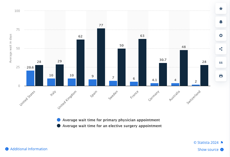 Fact: For primary physician appointments, Americans already wait longer under our exploitative for profit model than do people in nations with universal healthcare. Frankly, I marvel at this allegation as I reflect over the fact that it took us more than two years to get our daughter the critical life saving medication she needed, only because our exploitative for profit health insurance company refused to accept our doctor’s medical instruction. In reality, wait times in the United States are shorter only for elective surgery, but for primary care or for critical care, the United States is the worst out of any nation with universal healthcare.