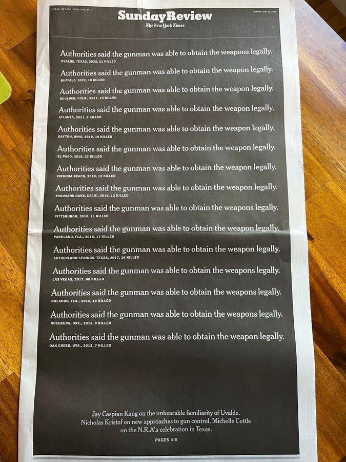 In fact, the right time was much earlier — like after Uvalde, Parkland, Buffalo, or Aurora, Las Vegas, Orlando, or Sandy Hook, or Oak Creek, or El Paso, or Sutherland Springs, or Tree of Life, or Columbine — hopefully you get the point.