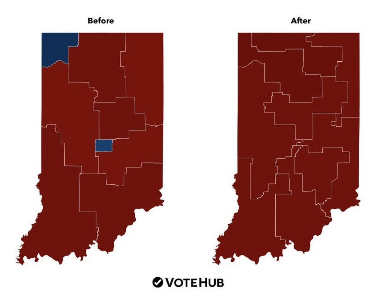 Ordinarily, redistricting takes place once a decade—a process designed to reflect population changes, not the political whims of a president desperate to avoid another electoral defeat. Yet this month, Indiana lawmakers have redrawn maps years ahead of schedule. Not by Hoosiers. Not by civic groups. But by Donald Trump and Gov. Braun, who are threatening primary challenges against any Republican state senator who resists. The Indiana House has already voted 57-41 to pass fully gerrymandered Congressional maps, and is sending it to the Indiana Senate.