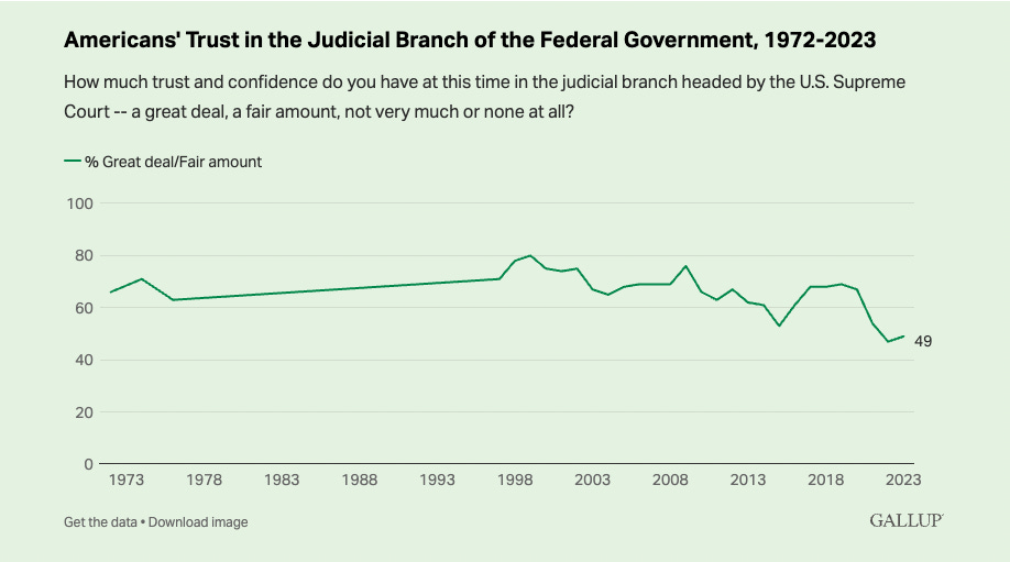 Third, SCOTUS desperately needs meaningful ethics reform to regain its legitimacy, and that just won’t happen with the current SCOTUS. A recent Gallup poll shows that while the Supreme Court enjoyed a remarkable 80% trust rating in the late 90s, it is now at a historical low of just 49%.