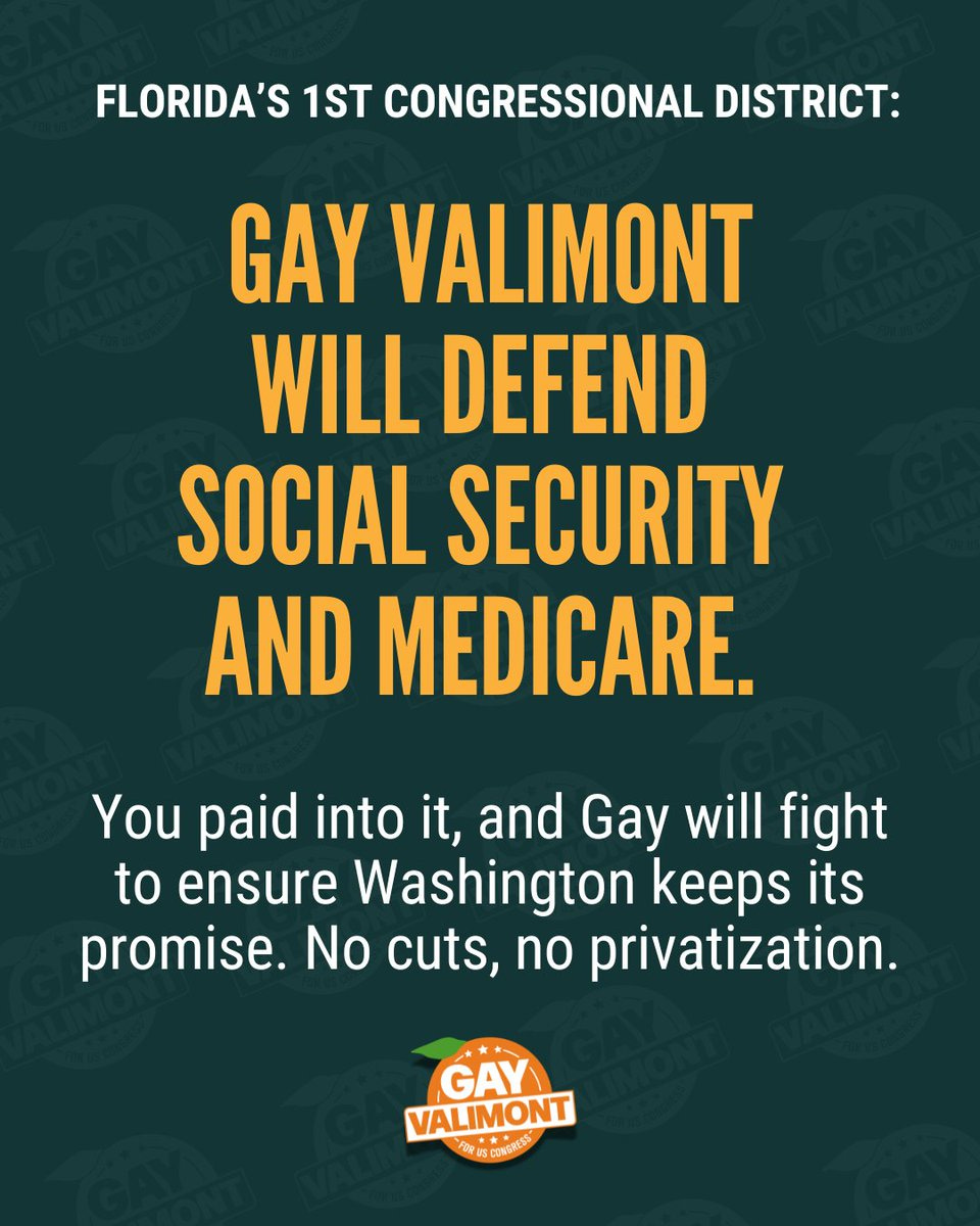 That’s why I’m throwing my full support behind Gay Valimont, a fighter who will take on the corrupt politicians who are making life harder for everyday Floridians. Her opponent? A rubber stamp carpet bagger who has never lived in the district, flown in by Trump and Musk to advance their agenda of tax cuts to billionaires, benefits cuts to veterans, and gutting Medicaid, Medicare, and Social Security. We cannot allow that to happen.