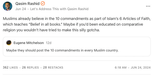 However, I’ve noticed such folks are not necessarily interested in facts. Hence, the next response was classical Islamophobia and ignorance to the fact that Muslims also believe in the 10 Commandments