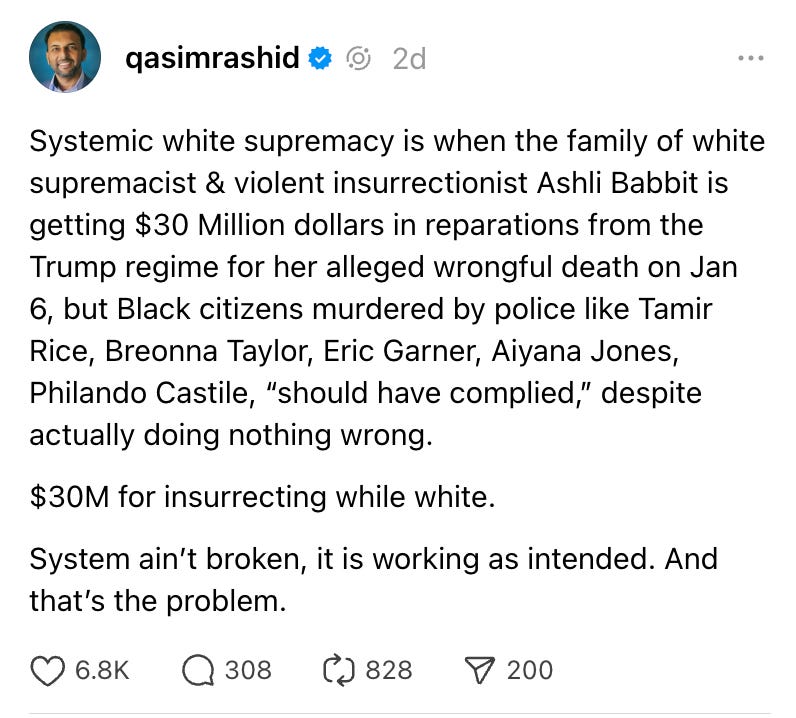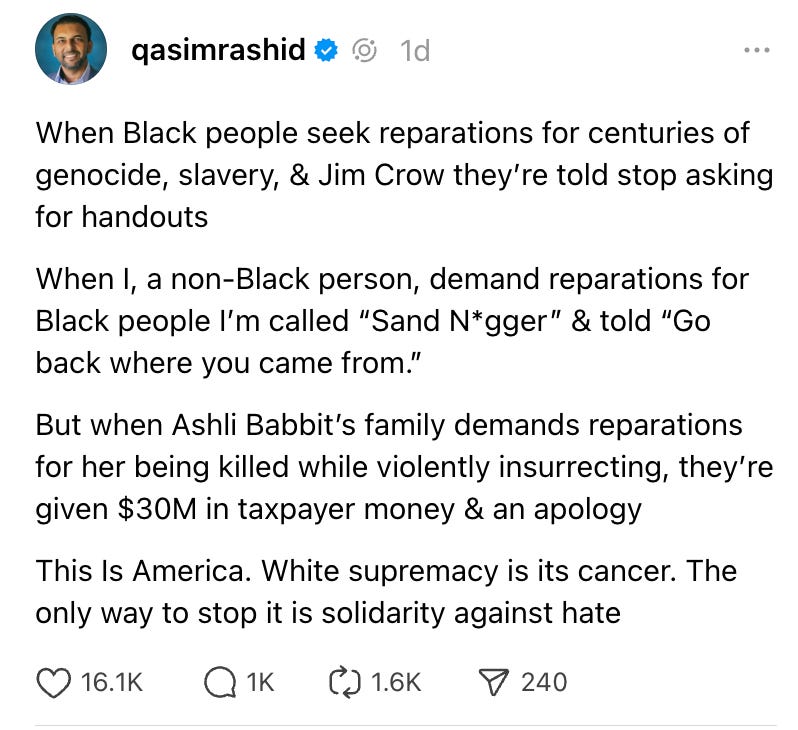 I followed up with another example of how white supremacy has always been lucrative in this country, at the expense of Black and brown lives. And how when I, as a non-Black person speak up for something as critical as reparations for Black Americans, white supremacists respond with similar vitriol.