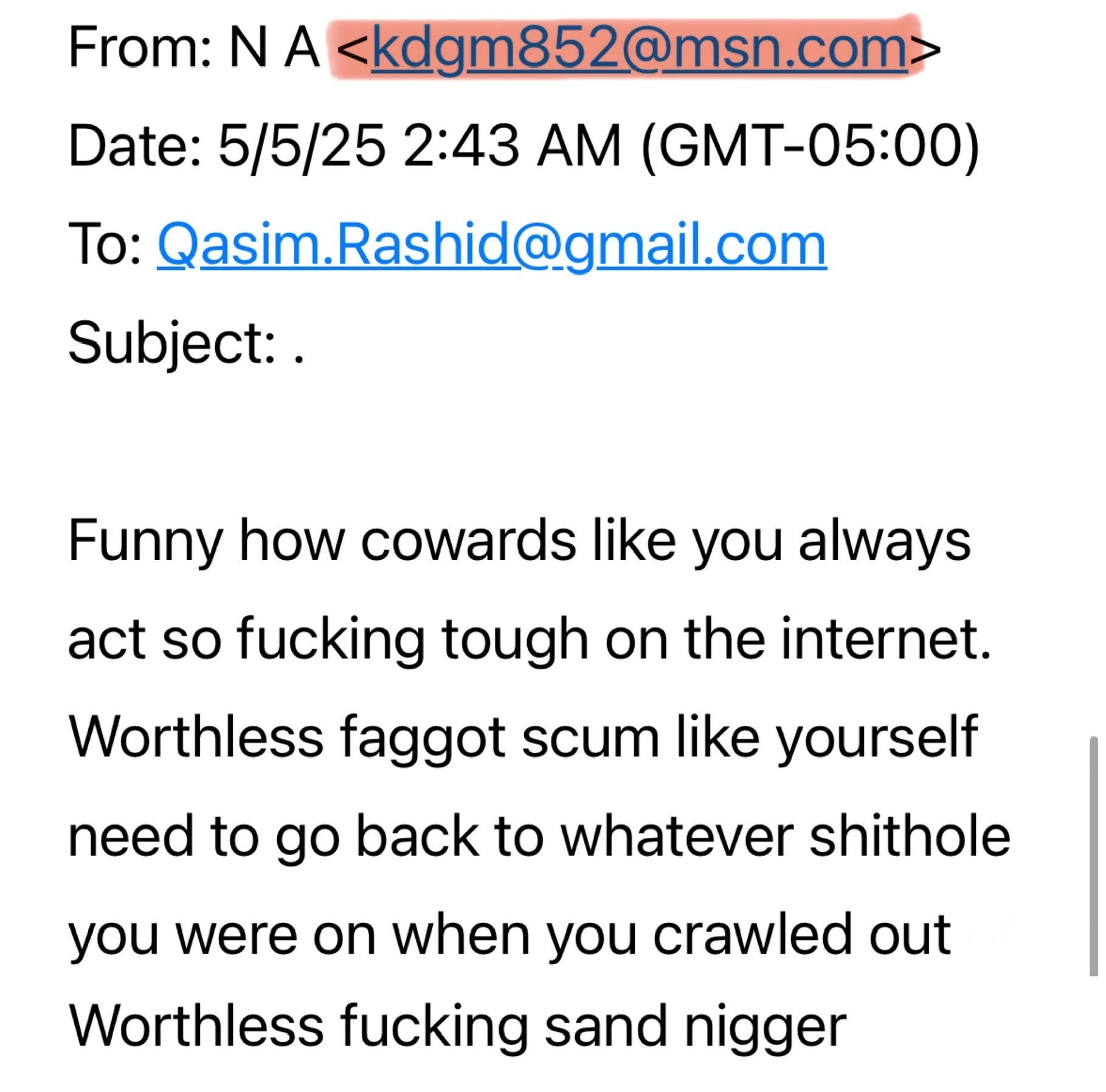 Last night, I received this from a racist who decided to use his email address, so I have no problem sharing that here. Content warning: Vile racism.