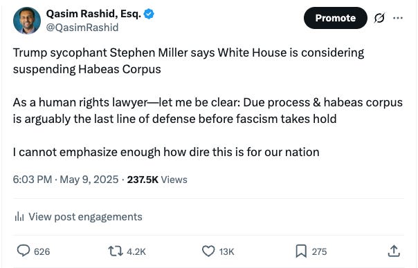 As a human rights lawyer, I have always been relentless in my calls to protect due process of law. Due process is the last line of defense between a functioning republic and a deteriorating dictatorship. When I learned that Trump’s advisor Stephen Miller is floating the idea of suspending Habeas Corpus, I loudly and clearly condemned the very suggestion itself.