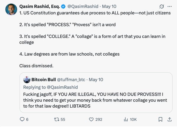 Unfortunately, the Overton Window has already shifted enough that MAGA cultists seem quite alright with the idea of shredding our Constitution and denying people due process of law. This is, to say it bluntly, horrifying for the future of our nation, and requires that we raise our voices loudly to hold the line and protect due process for all people in this country. Here are just a snapshot of the responses to me daring to demand due process of law.