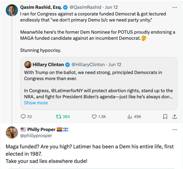 And this is but the tip of the ice berg of the additional millions that AIPAC is spending to unseat Bowman due to his ‘unforgivable’ position of demanding an end to the siege on Gaza that has, to date, killed at least 37,000 Palestinian civilians. It is simply mind boggling that Clinton would endorse a candidate for Congress—against an incumbent Democrat no less—who is propped up by the same MAGA extremists that helped defeat her.