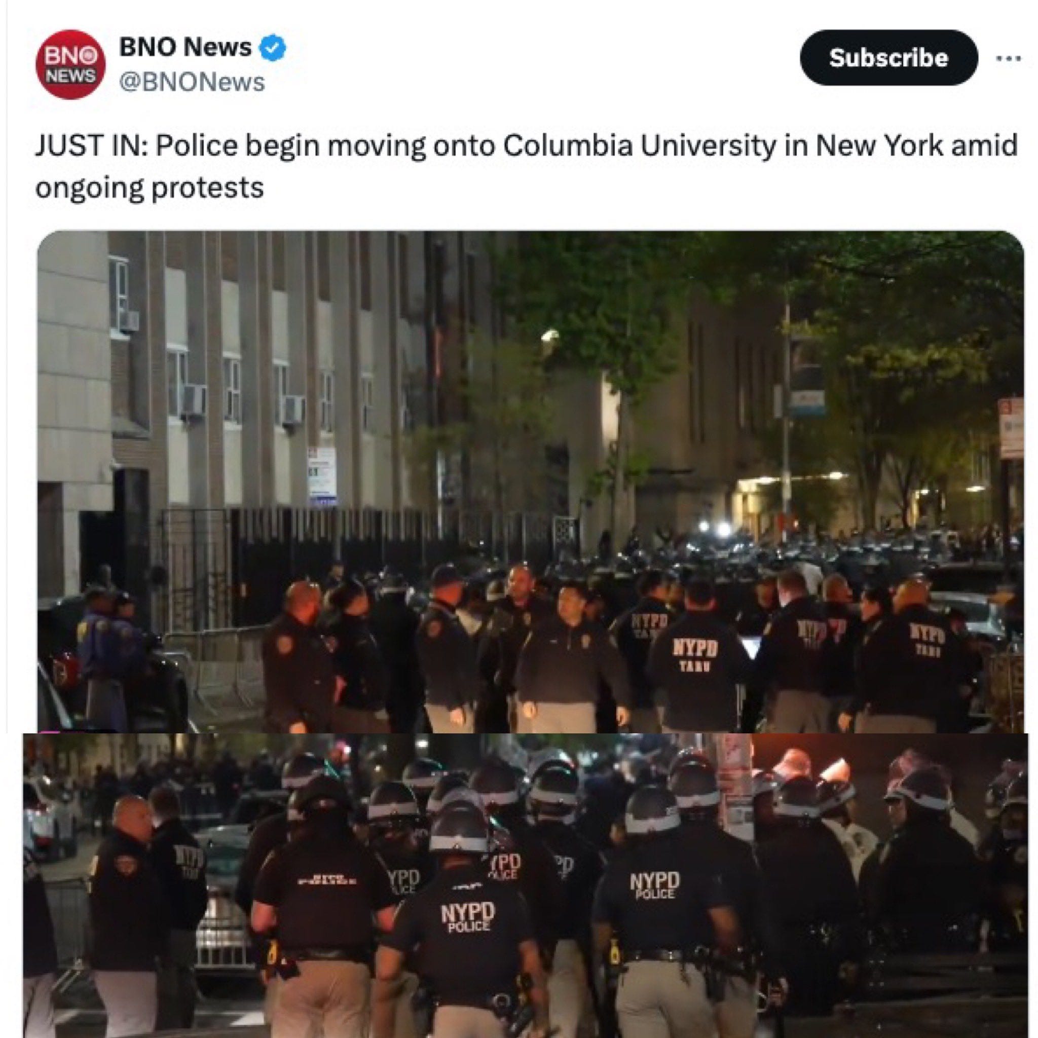 As if 1968 never happened, tonight in 2024 Columbia University is deploying the NYPD against students protesting the war in Gaza, which has to date killed more than 34,000 Palestinians, at least 70% of whom are women and children.