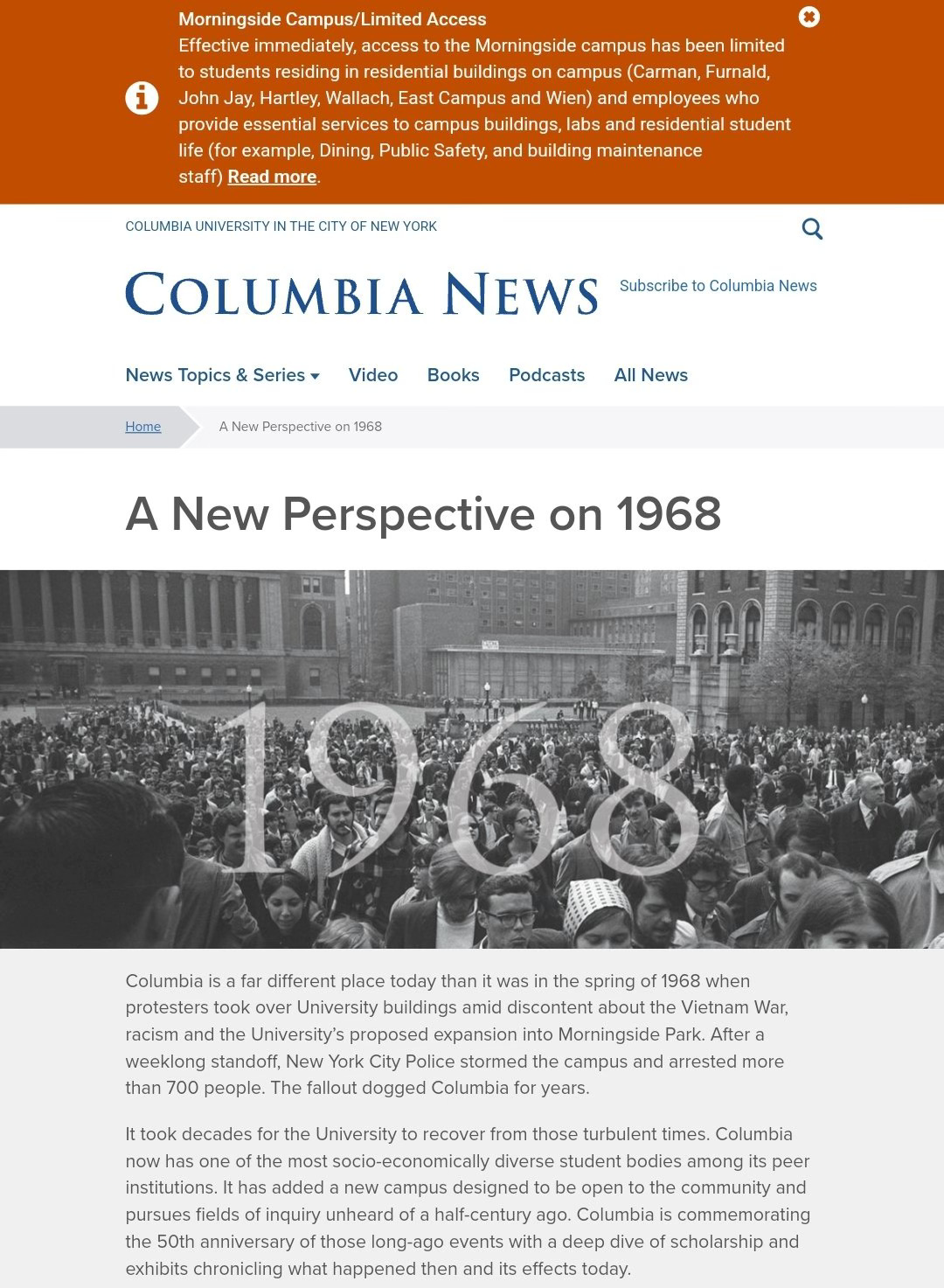 But perhaps most remarkably is this third excerpt—it is from Columbia’s website as of the publication of this post. On Columbia’s website, the University recalls and laments the 1968 violence against students and declares without a hint of self awareness, “Columbia is a far different place today than it was in the spring of 1968.”