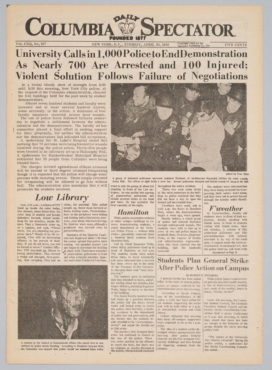 On April 30, 1968, the Columbia University newspaper called the Columbia Daily Spectator ran this front page: “University Calls in 1,000 Police to End Demonstration As Nearly 700 Are Arrested and 100 Injured; Violent Solution Follows Failure of Negotiations.”