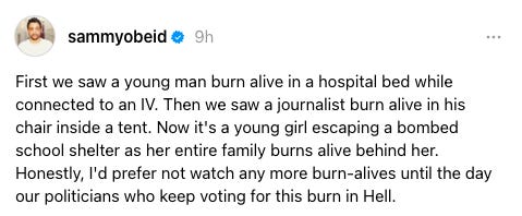 And these reports were only from the first two months of bombing Gaza. The atrocities that have unfolded since further add to this death toll and mass killing by fire. And then there are the countless horrific stories like of Dr. Alaa al-Najjar, who as reported, “left her ten children at home when she went to work in the emergency room at the Nasser Medical Complex in southern Gaza. Hours later, the bodies of seven children arrived - most of them badly burned.” In total, the Israeli military killed nine of her 10 children by targeting them at home and burning them to death.