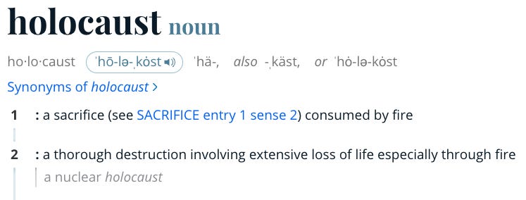 Let’s start with the definition. The Merriam Webster’s Dictionary defines holocaust as “a thorough destruction involving extensive loss of life, especially caused by fire.”