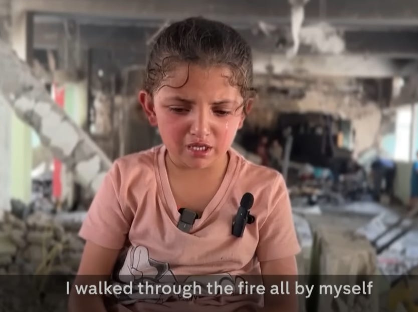 Content warning as below I show the video of a young girl named Ward Al Sheikh Khalil escaping the fires ignited by Israeli night raids. Bombings and fires that crushed and incinerated her loved ones. Ward miraculously survived, while her mother, two brothers, and three sisters did not.