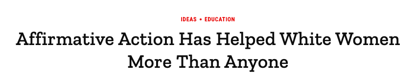 First, explain the history of who Affirmative Action benefitted most—because it was not Black people. In reality, the demographic that benefitted most from Affirmative Action—more than Black, Indigenous, Latino, and Asian Americans combined—are white women. As TIME Magazine reports: