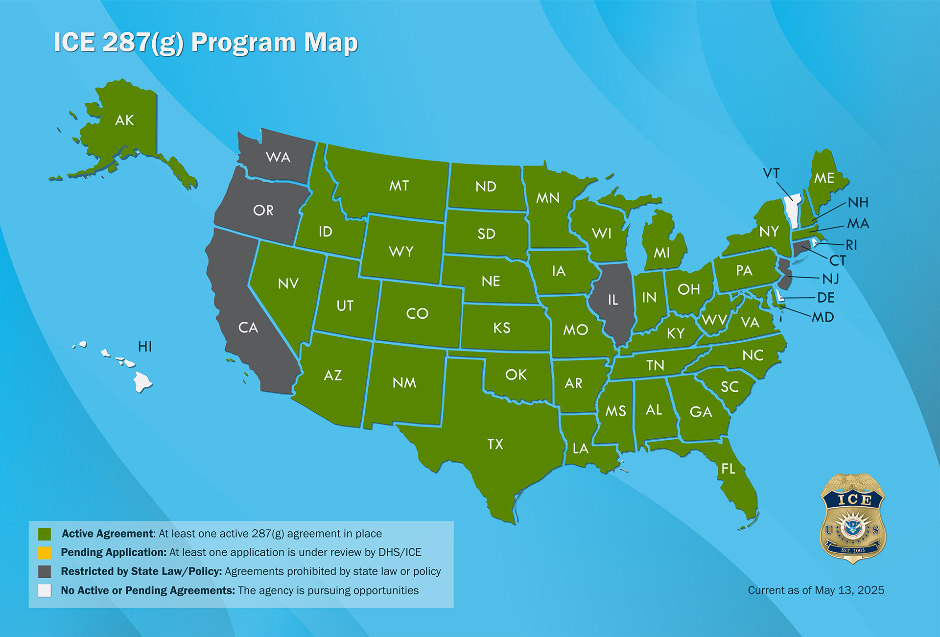 Currently, ICE has some form of a 287g agreement with now more than 1,000 police agencies across nearly all 50 states—which I have uploaded here for your convenience. This number has dramatically increased. When Trump’s term started, there were roughly 250 such agreements across 25 states. Now, there are 1067 such agreements with local police, and 60 pending 287g agreements. Only six states have banned 287g agreements (Washington, Oregon, California, Illinois, New Jersey, and Connecticut). Only one state has no active 287g agreements (Vermont). Every other state has active 287g agreements, and that is where we must get to work to repeal them.