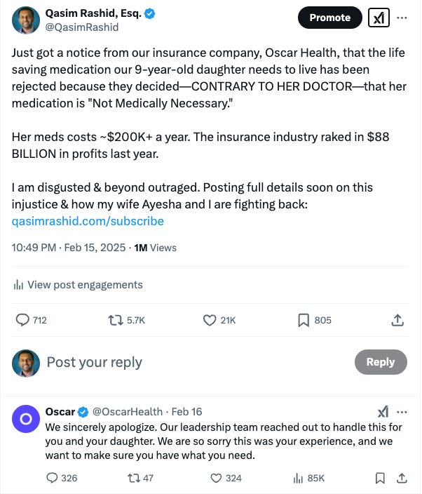 My wife Ayesha and I have an incredible 9-year-old daughter who suffers from a life threatening and incurable chronic illness. Last December we co-wrote a painful piece about how our health insurance company repeatedly denied her the life saving care she needs to live. The piece, When Insurance Rejects Life Saving Care, went viral, and currently has more than 100,000 reads across platforms. Now in 2025, that same insurance company has denied our daughter’s life saving medication once more—and we’re no longer letting this suffering continue in silence. Let’s Address This.