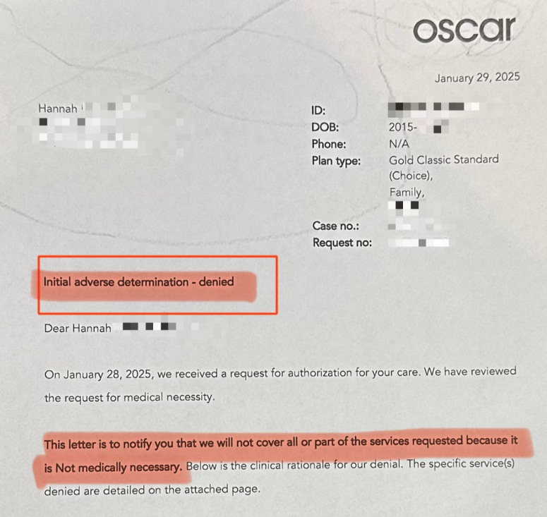 This story is one story of millions. It is from the perspective of my opinion, and my lived experience. And in that lived experience, my wife Ayesha and I exhausted every resource we could think of before going public with our daughter’s story. We previously did not name the insurance company, Oscar Health, because we had just submitted a claim for our daughter’s medication for 2025, had upgraded to their Gold Plan (i.e. the most expensive plan available on the ACA), and hoped perhaps this time they would approve that critical medication. We were wrong, and instead received the below notice—once again rejecting our valid claim, declaring it was “Not Medically Necessary.”