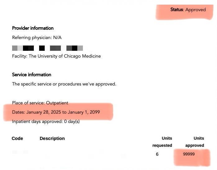 And then, within 12 hours, on a Sunday no less, Oscar Health called no less than seven times, leaving multiple messages, asking to speak. And just like that, our claim was approved not just for 2025 and not just for the the units of medication we requested—but unlimited units indefinitely (or at least until 2099).