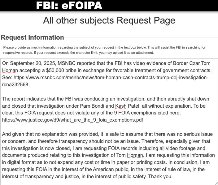The reason I clarify these two positions is as follows. If truly no illegal act was committed, then Kash Patel should have no problem fulfilling my FOIA request and granting the public access to the initial internal complaint filed, the secret FBI recording of Homan allegedly accepting a bribe, and the discussion around why none of that is illegal behavior. As the pro “stop and frisk” pundits often claim, “If you’ve got nothing to hide, then you should have no problem with police searching you.” In this case, however, Kash Patel is telling us there’s nothing to hide. So logically, he should have no problem with the American public having access to the information he’s so far hiding.