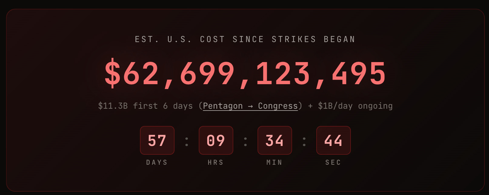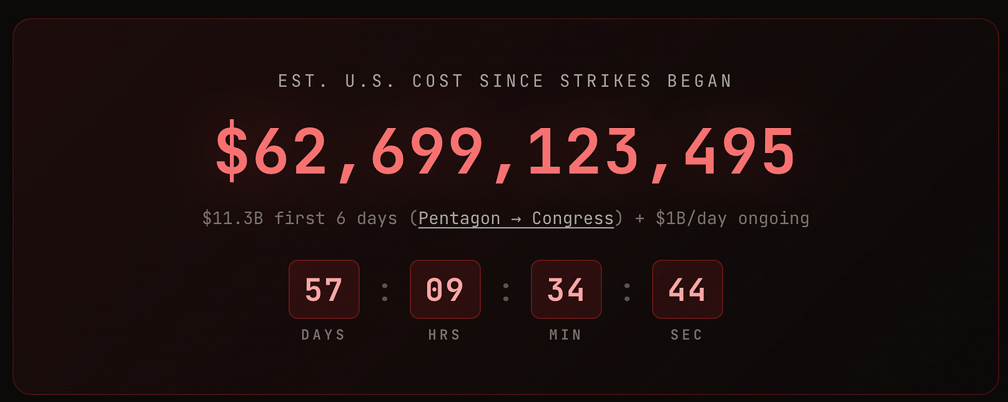 Trump’s illegal war on Iran—launched without congressional authorization, in violation of international law—has now cost American taxpayers more than $62 billion. Fifteen American soldiers are confirmed dead. Nearly 2,000 Iranian civilians have been killed. Corporate media did not mention this last night.