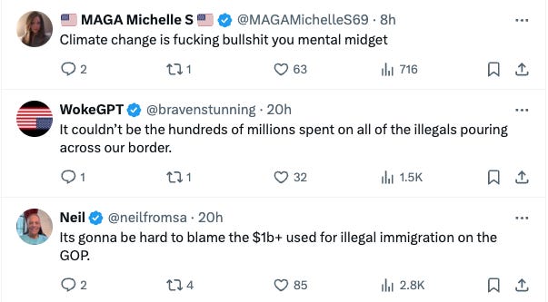 Meanwhile, thousands of MAGAs tweeted back to me in colorful language, claiming climate change is a hoax and that we shouldn’t be spending any money on undocumented immigrants anyway.