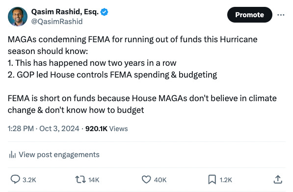 As any basic civics lesson should teach you, the House controls the purse strings. Therefore, whatever budget FEMA has, is due to the GOP led House—which ultimately controls FEMA budgeting. Therefore, FEMA being short on funds is a result of House Republicans refusing to adequately fund FEMA. This could be because MAGAs don't understand how finances work, or because they don’t believe in climate change, or likely a combination of both. Either way, Republicans seem to always find money for tax cuts for billionaires, private school vouchers for the wealthy, and subsidies for Big Oil and Big Pharma. But apparently funding disaster management during a climate crisis is just too difficult.