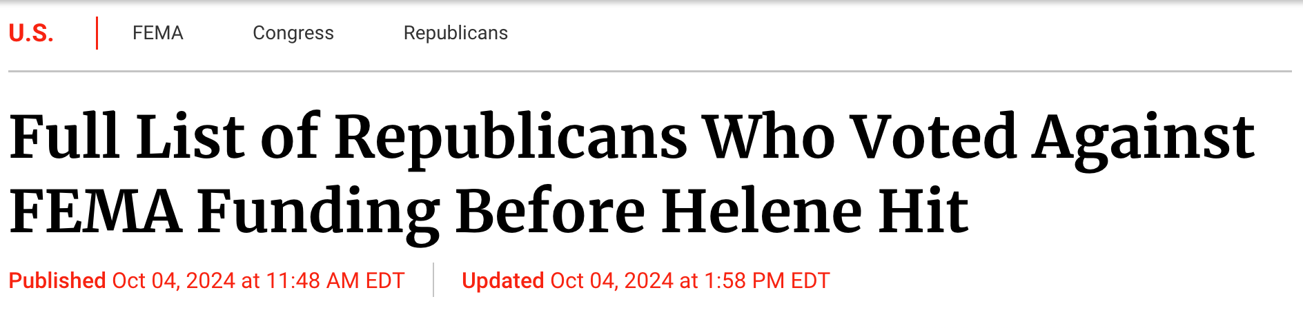 Do not let racist anti-immigrant rhetoric detract from MAGA incompetence in finance and budgeting. The solution is clear—properly fund FEMA and ensure the people devastated by Hurricane Helene can get the support they need. Unfortunately, that is the one thing the GOP seem incapable of doing. Thus, proving that old saying: Republicans claim government doesn’t work, then they get elected and prove it.