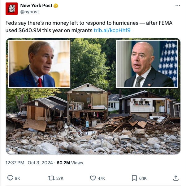 Debunking a viral NY Post story that fabricates claims about FEMA funding and immigrants to detract from Republican cruelty and incompetence