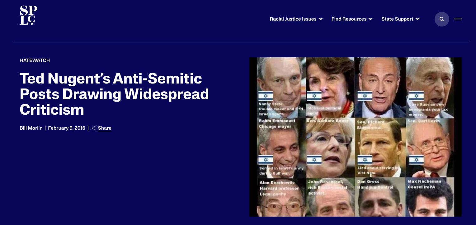 Yes, that Ted Nugent—who is an ardent Trump ally. That Ted Nugent, who has pushed white supremacist and racist rhetoric for decades. That Ted Nugent, who has an SPLC-documented hate profile specifically for extensive, decades long history, of antisemitic rhetoric and demonization of Jewish people.