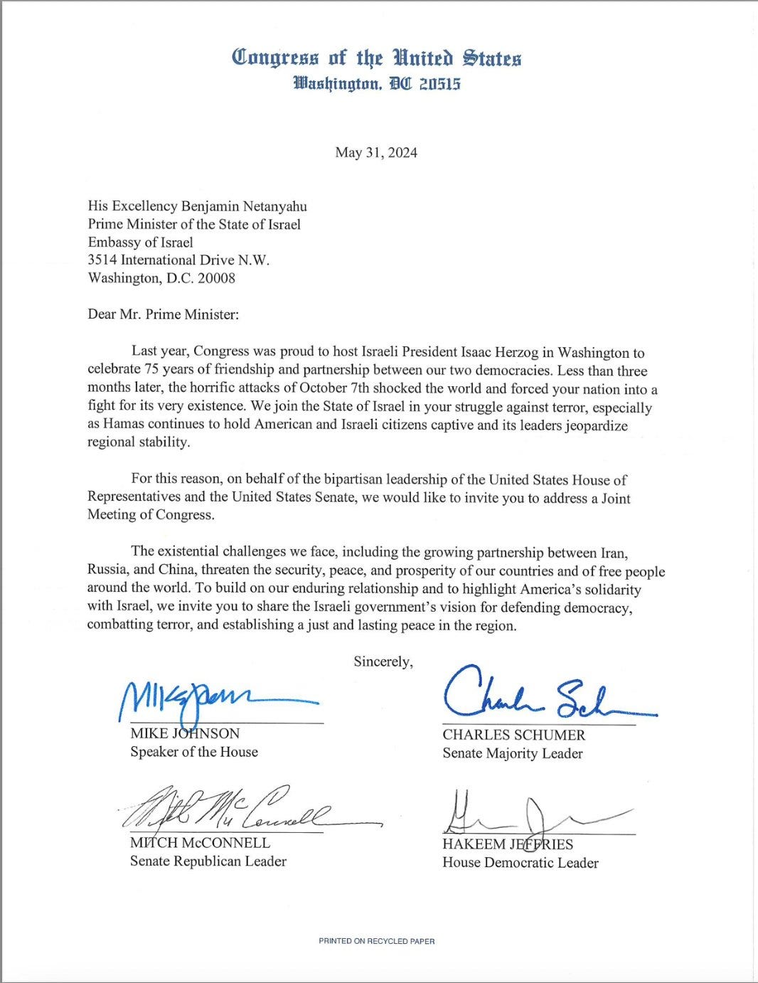 It’s official. Israeli Prime Minister Benjamin Netanyahu will address a joint session of U.S. Congress on June 26. Below is the letter bearing the signatures of all four Congressional leaders who formally invited him last week.