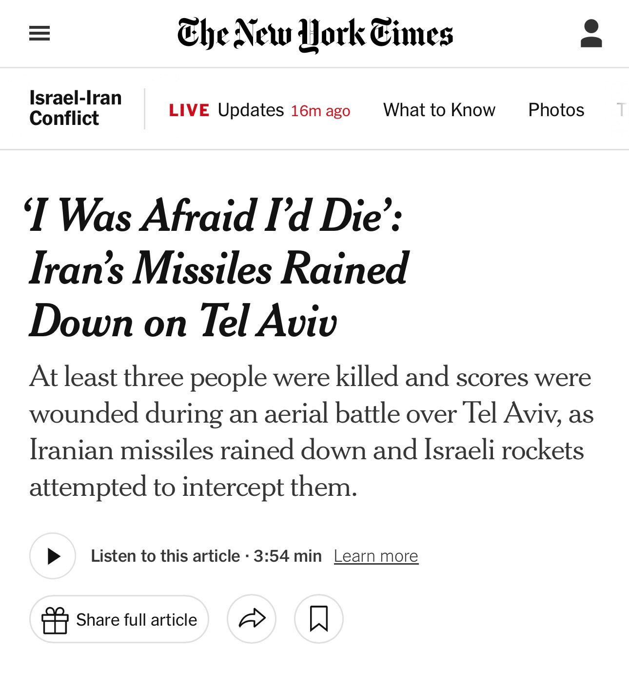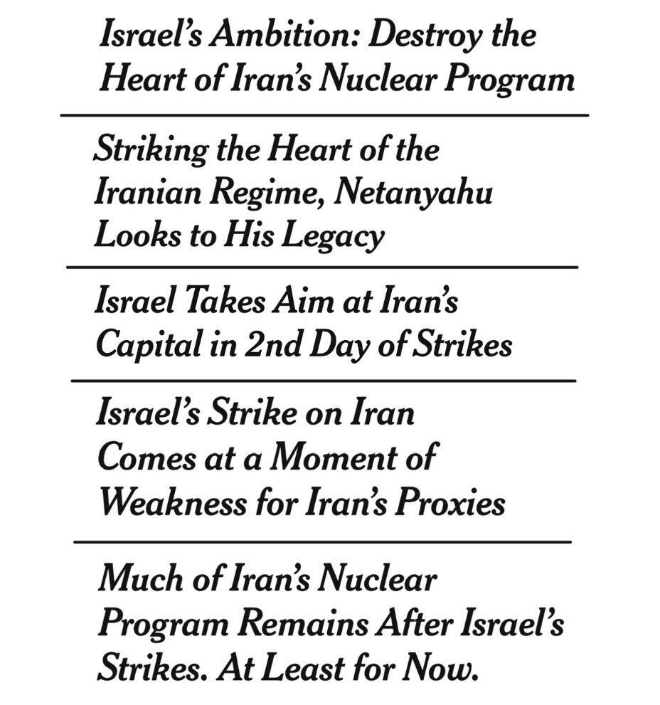 Now, compare these above NYT headlines—which frame everything in defense of Israel’s justifications and Netanyahu’s legacy while wholly ignoring the devastation to Iranian civilians—with the below headlines, which fully humanize Israelis and demonizes Iran.