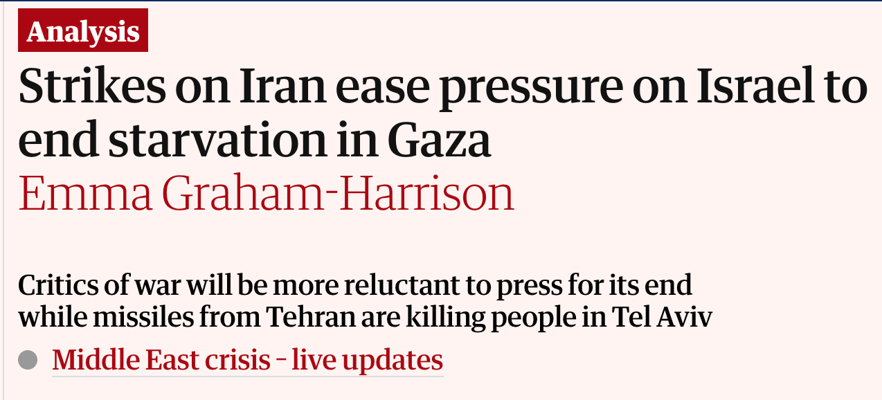 The UK Guardian added this indefensible headline to whitewash the Israeli government’s war crimes. Apparently, because Israel is also attacking Iran, Israel is somehow now less obligated to stop committing the war crime of genocide and starvation of Palestinians. Simply reckless.