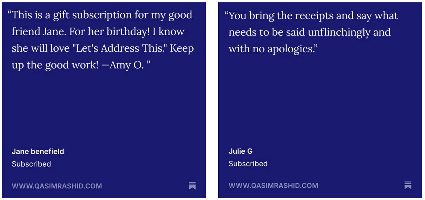 I receive hundreds of notes every week and I wish I could respond to them individually. Here’s just a snapshot of why you subscribed to Let’s Address This.