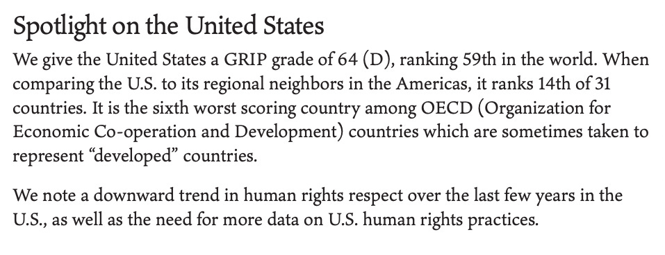 First, human rights globally are at historic lows. A 2023 study conducted by scholars at the University of Rhode Island found that 60% of nations receive a failing grade on human rights, only 20% received an A grade, and an F grade is the global median. The United States—the shining city on the hill—scores an abysmal D grade, ranking 59th globally, and trending downwards.
