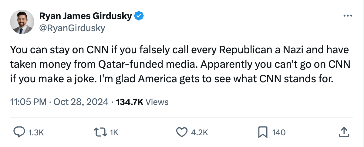 The bottom line is this. Girdusky is the symptom of a greater problem of the systemic racism that permeates so much of our political, media, and public discourse. Take note that Hasan’s ‘crime’ was merely stating that he is willing to speak up for the people of Palestine, which is why he condemned the hateful anti-Palestinian and anti-Muslim rhetoric from Giuliani and others at the MSG rally. And in response to this basic statement of standing up for a marginalized community, Girdusky, a man with a history of writing for a Nazi, decided to also demonize Hasan and insinuate he deserves assassination for daring to speak up. This is 2024 America, and this is the hateful and violent rhetoric Trump is empowering. Deplatforming Girdusky from CNN is a step, but we must do so more to hold all media accountable to stop platforming such extreme voices in the first place. As I wrote yesterday regarding Trump’s rally at Madison Square Garden: