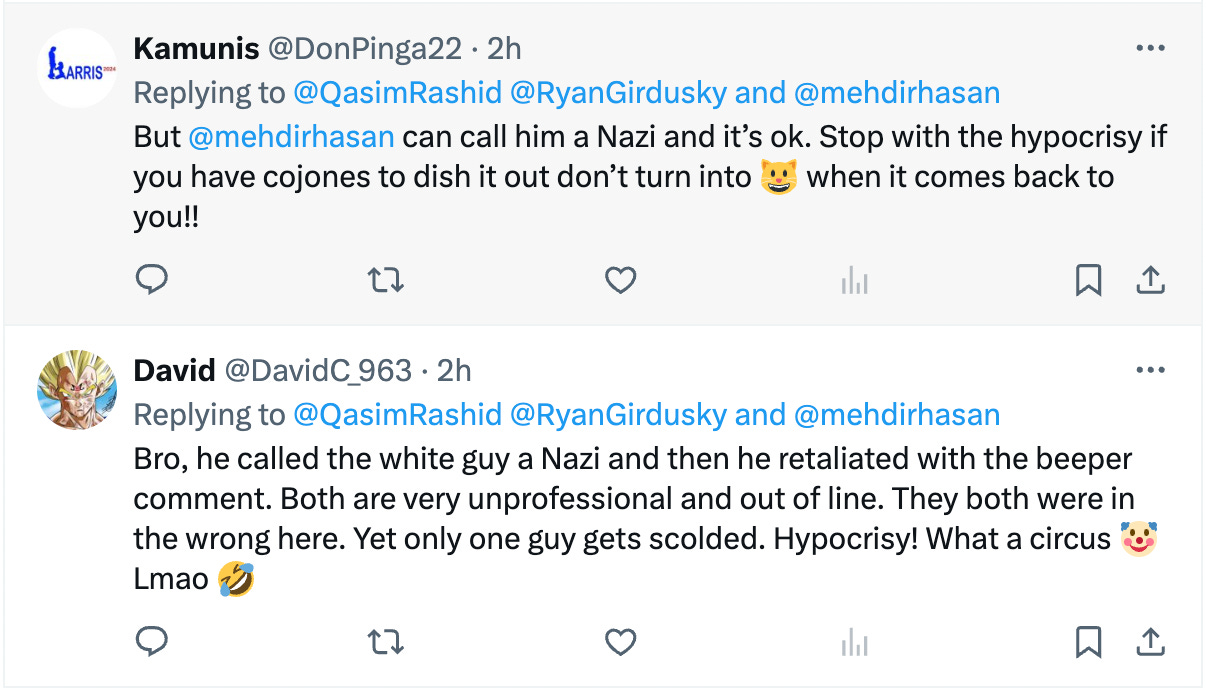 Many on the right are defending Girdusky’s racist comment, claiming it was reactive to Hasan calling him a Nazi. I continue to receive ongoing comments to this effect.