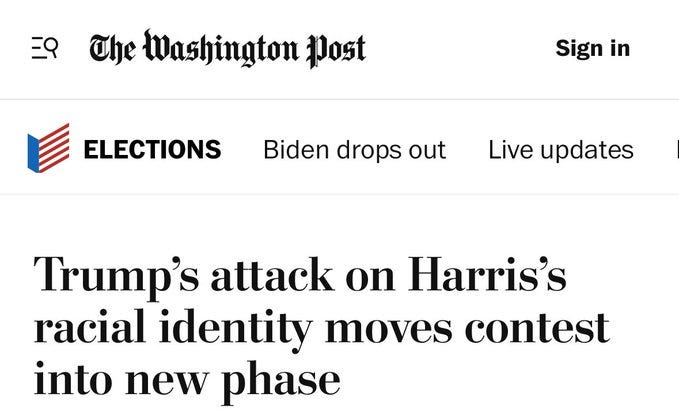 The Washington Post’s tagline is “Democracy Dies in Darkness,” and I cannot figure out if this is a call to action to expose injustice, or a personal goal they’re trying to achieve? Because in response to Donald Trump’s grotesque racism targeting Kamala Harris, this was the Washington Post’s headline: