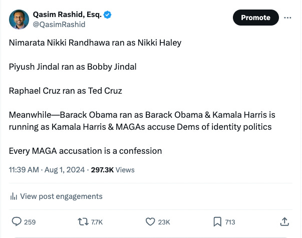 Not only is all of the above a lie, the fact that Trump wants Kamala Harris investigated for also being Indian is authoritarian level racism. Adding to this absurd Trump stance is that Trump’s own VP candidate JD Vance has mixed Indian children with his wife Usha Vance. I’ve documented the grotesque racism she’s facing for being Indian American. In short, what we’re dealing with is a nakedly racist attempt to fear monger to a racist MAGA base that if you don’t vote, a Black or Indian person who (allegedly) keeps changing their identity will be in charge.