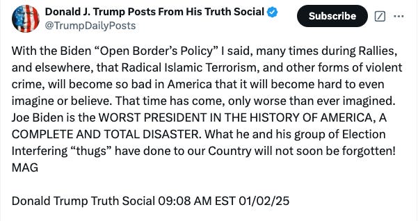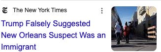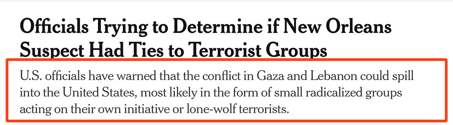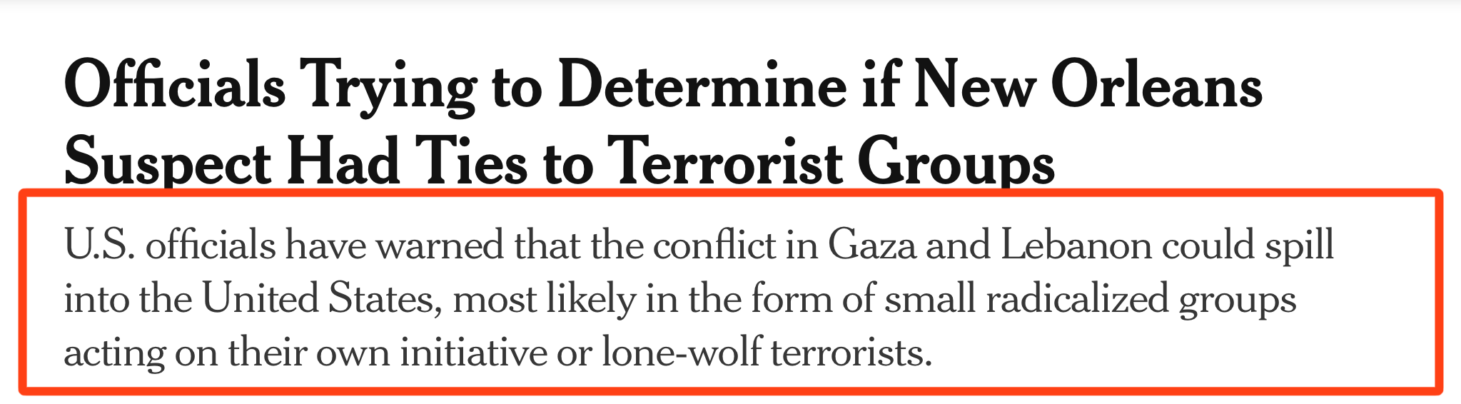 Not content with refusing to hold Trump accountable for dangerous lies, the New York Times piled on with actual disinformation. For example, they added that officials are trying to determine if the New Orleans suspect had ties to terrorist groups. To be sure, investigating potential motivations is important. However, the sub headline highlighted below then alleges this attack is connected to Israel’s genocide in Gaza and Lebanon—a completely unsubstantiated claim.