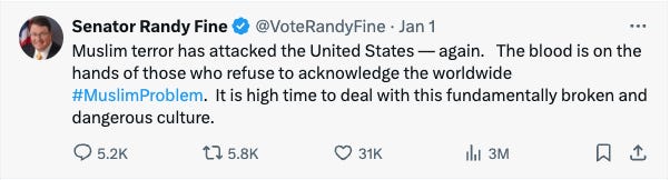 And Trump’s lackeys, likely knowing Trump would shift with the wind, had already followed suit. Known racist, Trump ally, and MAGA politician Randy Fine described it as a “worldwide Muslim problem.” Suddenly, one person’s violent acts represent 1.6 billion Muslims worldwide. Imagine the rightful outrage of someone described it as “the worldwide Jewish problem?” We would rightly condemn such grotesque antisemitism. But when it comes to similar anti-Muslim bigotry, it is celebrated.