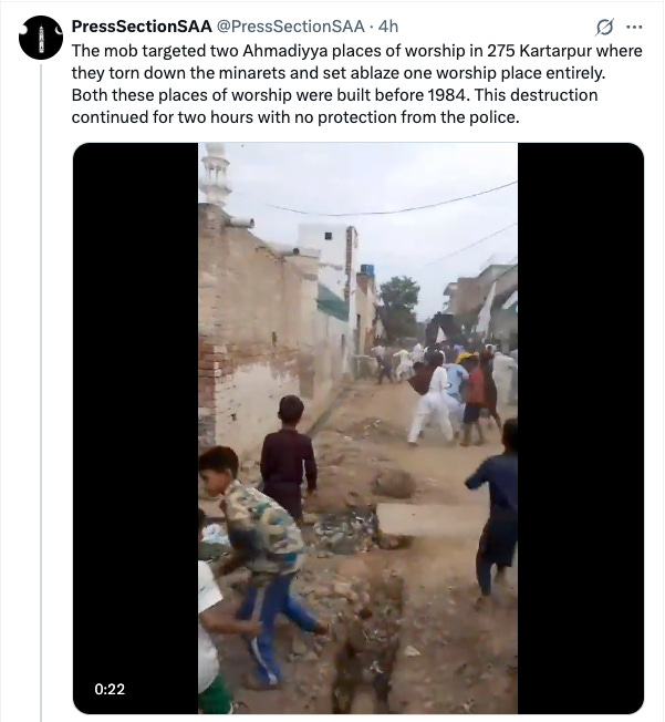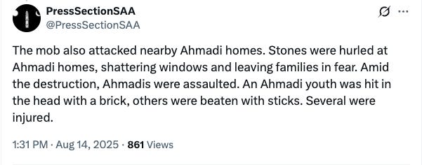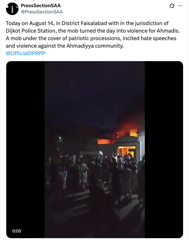 Even literally on Pakistan’s Independence Day, the persecution of Ahmadi Muslims in Pakistan increased with yet another attack on Ahmadi mosques. Corporate media largely ignores these atrocities, which is why you likely have not yet heard of these attacks. And sadly, the Pakistani government largely approves these attacks either by refusing to prosecute the instigators or by simply turning a blind eye. For example, see this important thread from Pakistan’s chapter of the Ahmadiyya Muslim Community, reporting on this latest attack, in which police took more than two hours to respond even as the violent attacks raged on.