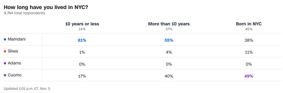 First, those in New York City less than 10 years voted 81-17 in favor of Mamdani. Is anyone shocked that those who previously lived outside of NYC overwhelmingly agree that NYC should be more affordable? Those in NYC more than 10 years still voted 55-40 in favor of Mamdani. The Post instead ignores those massive lopsided votes in favor of Mamdani, and instead focuses on the lifelong New Yorkers who voted by a smaller margin 38-49 in favor of Cuomo. Even then, to those native New Yorkers who voted for Cuomo, Mamdani has made clear he wants to earn their trust, declaring: